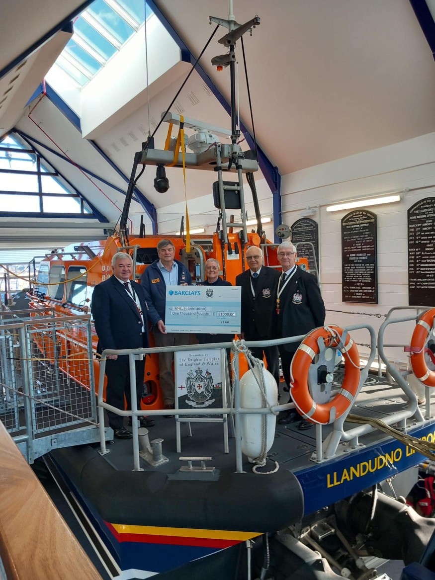 Last week, members of the Knights Templar visited Llandudno Lifeboat Station. During the visit, the group presented a cheque for £1,000 to Capt. Marcus Elliot, Lifeboat Operations Manager, and Sue Perkins, Fundraising Chair for the station.