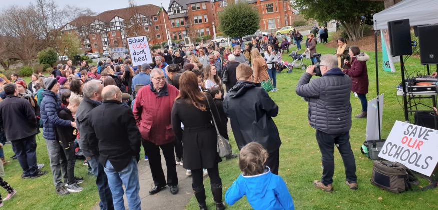 Furious families, teachers and pupils gathered this weekend to make their voices heard after local authority budgets of 3.2% put school activities, jobs and learning under threat in Conwy.