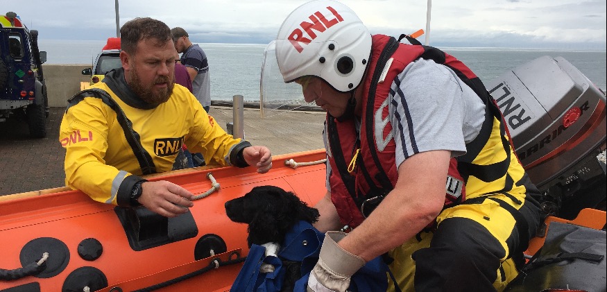 Given the dog’s precarious position, the Lifeboat Helm left a crew member at the scene while additional hands were collected from the nearby boathouse. With the extra reinforcements the five-lifeboat crew were able to safely retrieve the dog and return him to his very relived owners waiting at the boathouse.