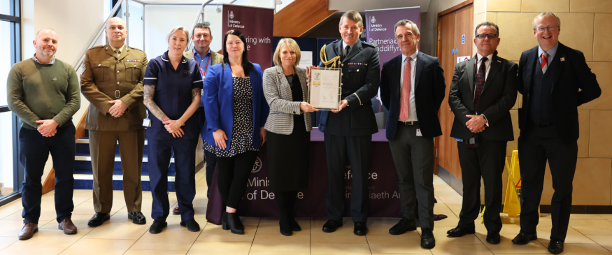 Alongside BCUHB senior leaders, the signing ceremony included Sargeant Norma Filmer, 203 Field Hospital, Tony Fish, Regional Employer Engagement Director (North), Reserve Forces' and Cadet Association for Wales, Mark Birkill Veterans NHS Wales Team Leader, Kate Jackson Veterans Clinical Lead for Ysbty Glan Clwyd, Ian Pritchard Armed Forces Liaison Officer, and Zoe Roberts, BCUHB Armed Forces Lead.