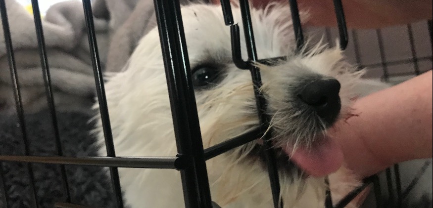 George the puppy needed help after getting his teeth stuck on the bars of his crate. Kate Atkins had been crate-training her 11-week-old Westie pup on 15 March when she heard him squealing and found he’d got his top jaw stuck on the bars. She called the fire service and RSPCA officers for help.