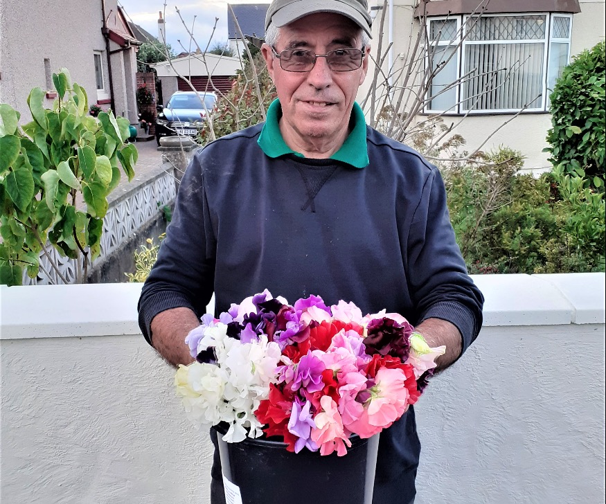 Bunches of sweet peas have been delivered by Rotary, including some for Llandudno Community Hospital and St. David’s Hospice. Brenda Fogg of Hope Restored Llandudno also found herself and her charity colleagues the recipients of Allan’s colourful blooms, along with several people known to be living on their own