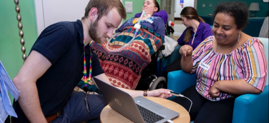 “We asked the graduates to help us come up with a piece of kit that would allow even the most disabled residents to join in. This is a project that started two years ago. The initial device was a wrist band that played musical notes as it responded to the movements of the residents wearing the band.