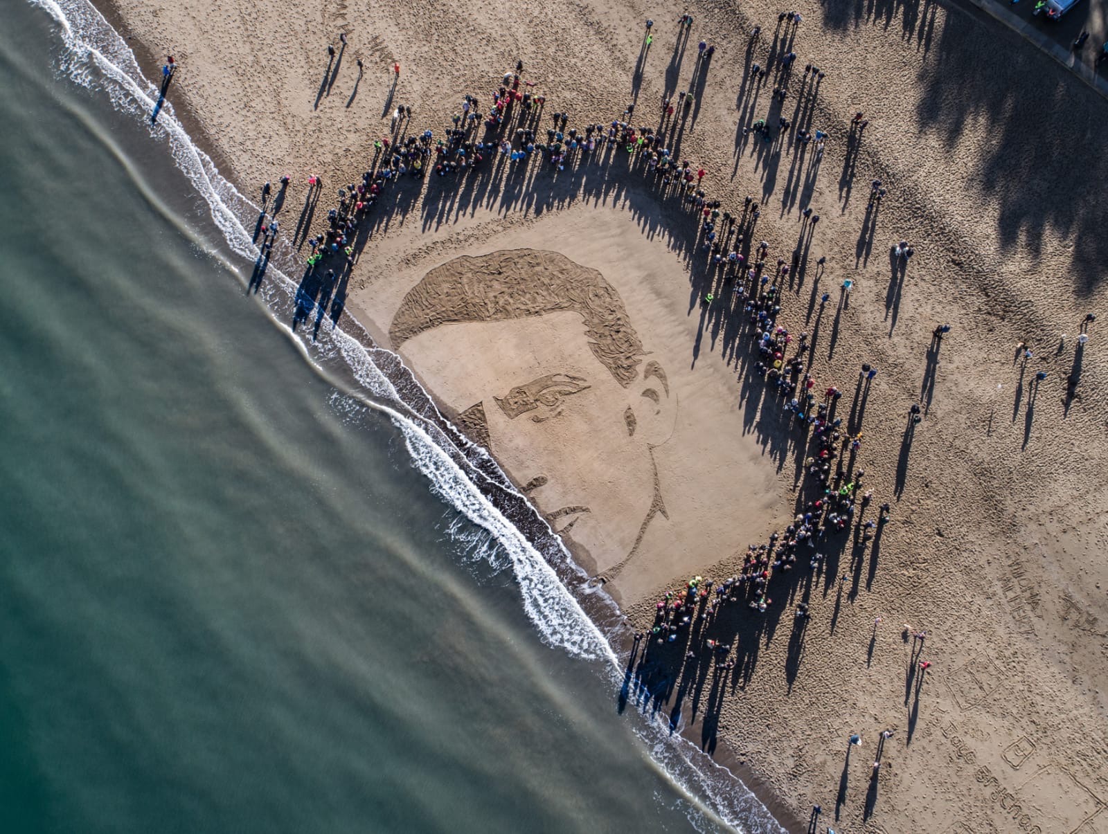 Volunteers worked tirelessly to ensure that the portrait was complete in time for members of the public to come and pay their personal respects on the beach just before 8am. The portrait which could be seen from the sky by a drone camera was beamed to special television monitors in Porth Eirias and beamed to viewers across the world. The portrait was finally washed and 'taken away' by the incoming tide shortly after 10.30am.